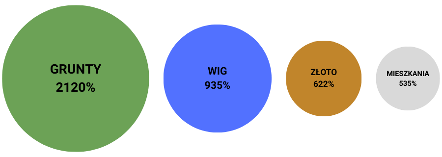 Wzrost wartości podstawowych produktów inwestycyjnych na przestrzeni 25 lat w latach 1995-2020. Grunt zyskał na wartości 4 razy więcej niż mieszkania.